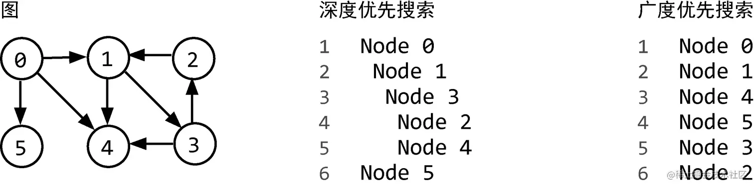 请参见下图关于图的深度优先搜索与广度优先搜索的描述(假设相邻节点按照数字顺序进行迭代)。