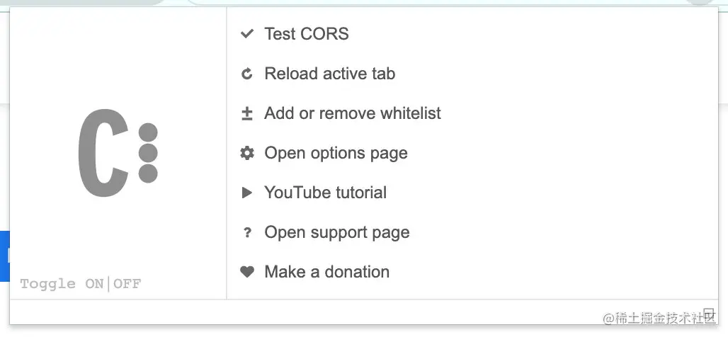 这个插件使用起来非常简单,只需要点击切换 on 和 off 的状态即可。 on 的时候会自动给请求头增加跨域功能,off 则相当于禁用了插件。