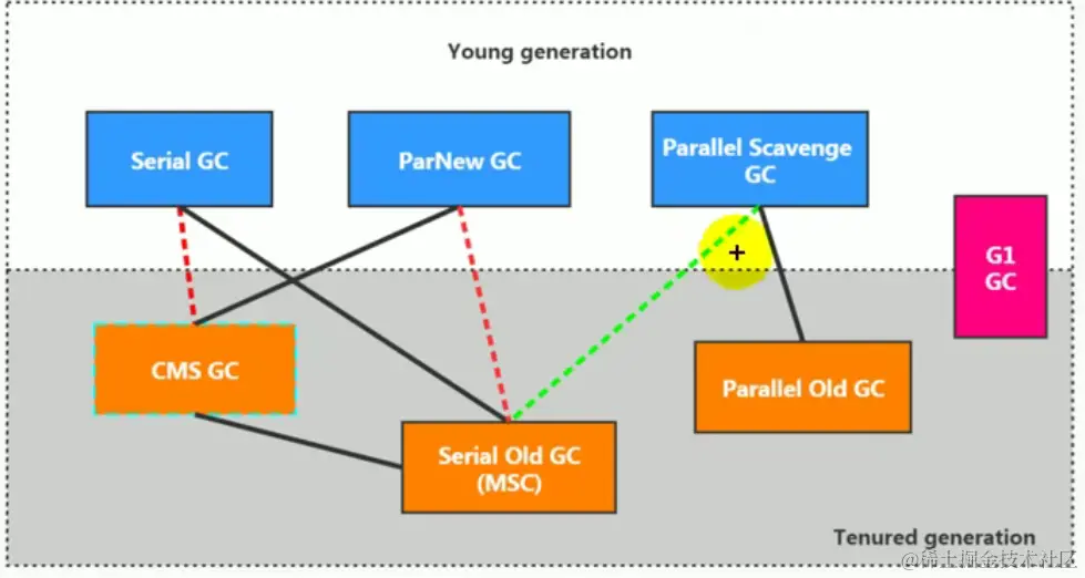 - 红色虚线为jdk8之前(不包含jdk8)存在的组合关系,jdk8之后移除 例如Serial+CMS; ParNew+Serial Old