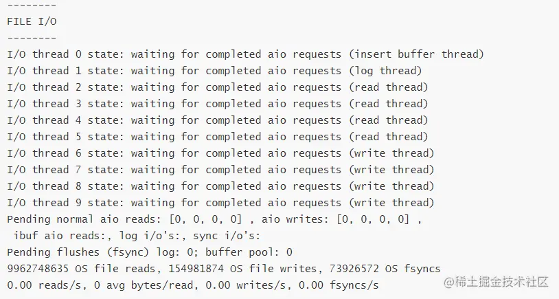 在InnoDB 存储引擎中大量使用了 AIO(Async IO) 来处理写IO 的请求,这样可以提高数据库的性能。而 IO Thread 的工作主要是负责这些IO 请求的回调处理。InnoDB 数据库引擎中的 IO Thread 有四种类型 write thread(4个) 、 read thread (4个)、 insert buffer(1个) 和 log IO thread(1个) 。