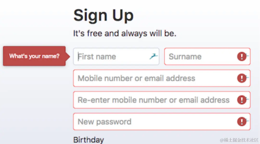 为色觉障碍的用户建立用户界面的一种方法是同时使用颜色和符号来传达信息。例如,在下图所示的错误状态中,有一个错误符号,以及错误字段上的红色轮廓。