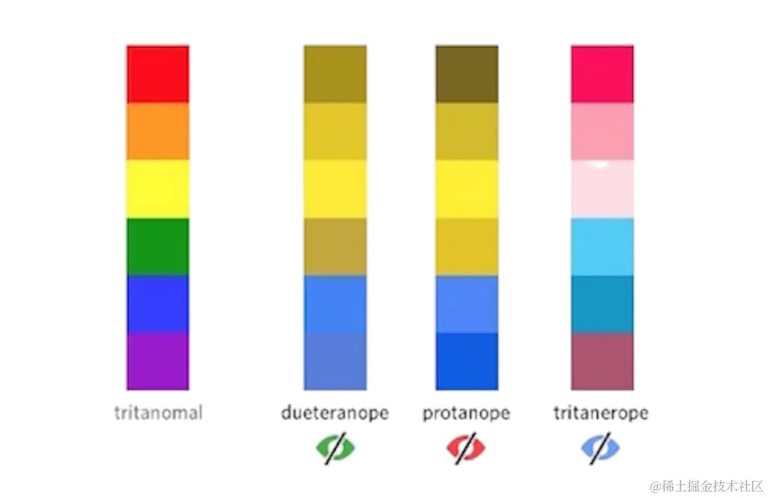 除了颜色对比度,为色盲用户建立也很重要。根据人们看不到的不同颜色,有多种类型的色盲--该图显示了其中的几种类型。