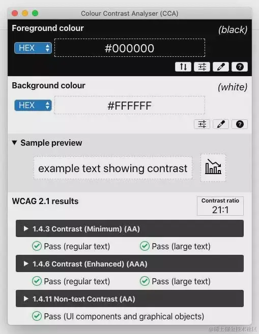要计算颜色对比度,有一个叫CCA(颜色对比度分析器)的有用工具。这个工具可以让你手动输入颜色代码或通过颜色选择器,并会告诉你颜色对比度。它还会告诉你对比度是否符合WCAG AA和AAA的要求。