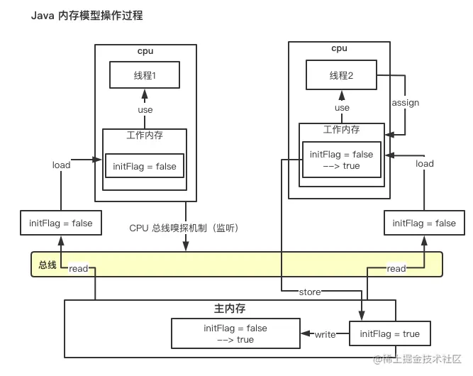 JMM 模型中变量修改示意图(以多核心 CPU 操作 initFlag 变量为例子)
