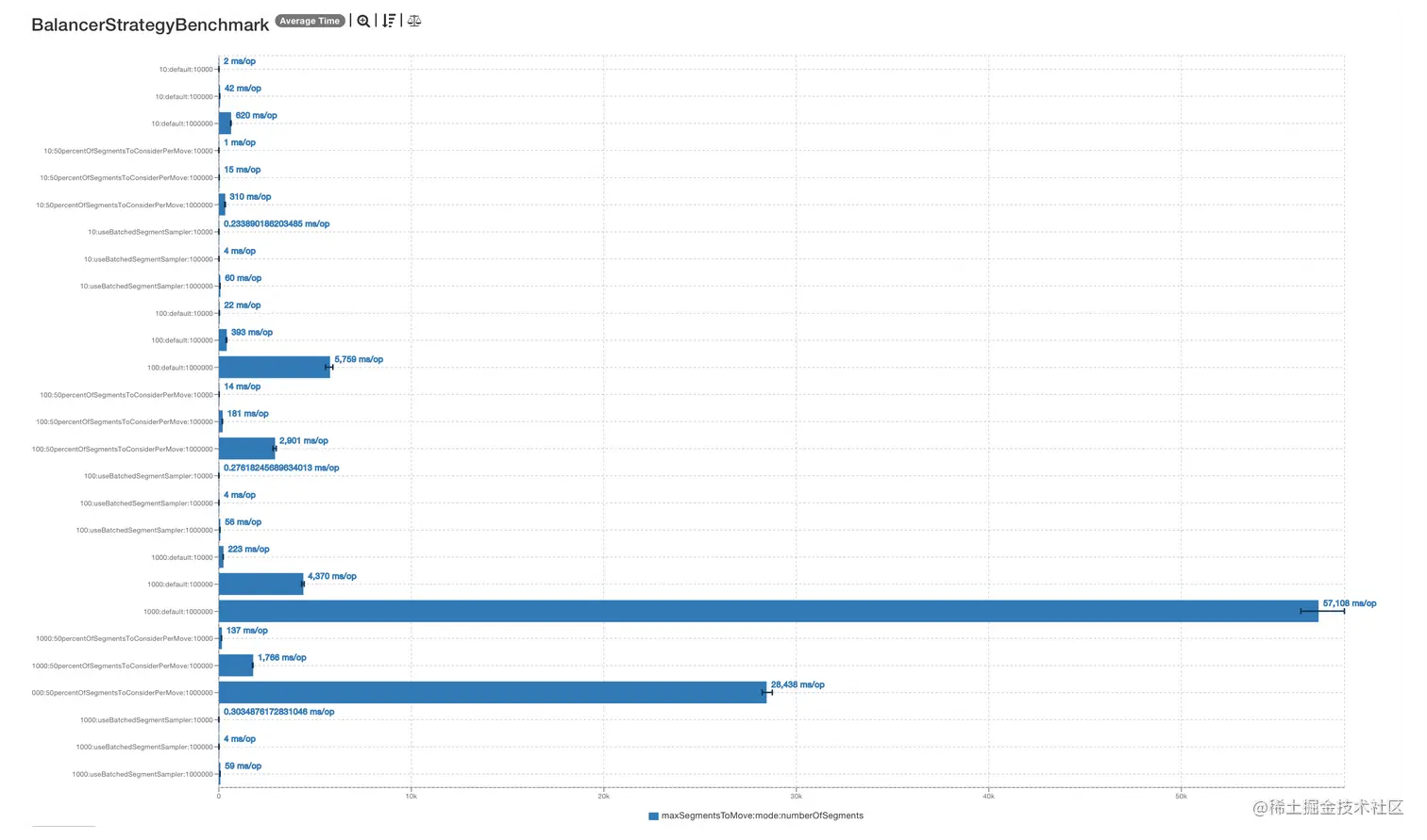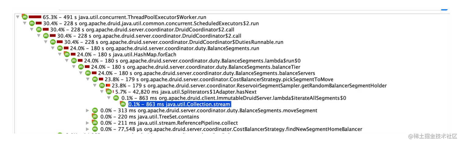 通过使用 JProfiler 工具分析,我们发现负载平衡算法中使用的蓄水池采样算法的实现存在性能问题。分析源码发现,当前的蓄水池采样算法每次调用只能从总量 500 万 segment 中采样一个元素,而每个周期需要平衡 2000 个 segment。也就是说,需要遍历 500 万的列表 2000 次,这显然是不合理的。
