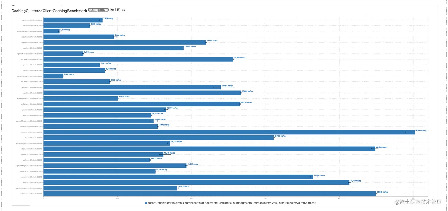 通过 benchmark 结果可以发现,segment 合并中间结果缓存功能不仅初次查询不存在明显额外开销,而且缓存效率明显优于其他缓存选项。