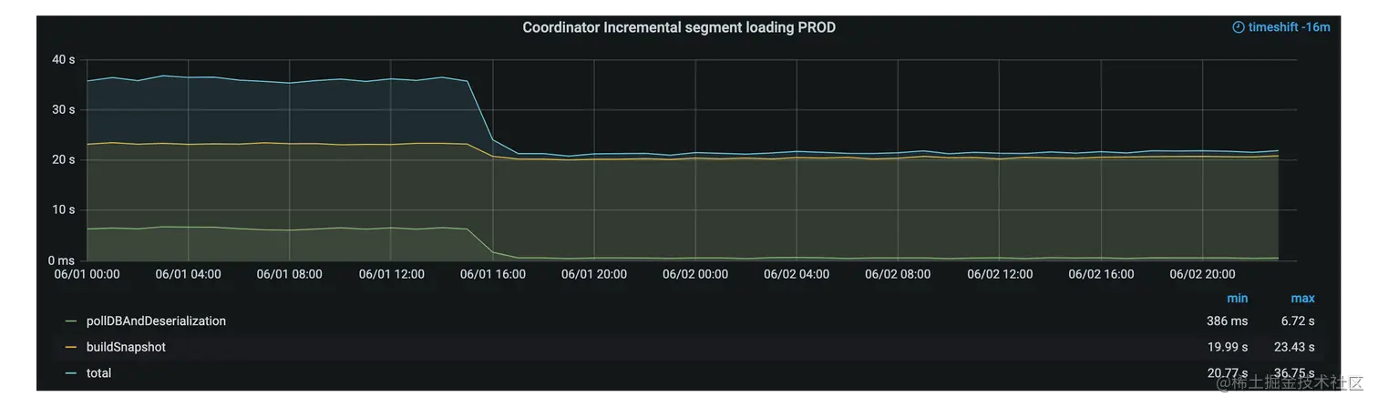 实现批量采样的蓄水池算法,只需要遍历一次 500 万的 segment 元数据列表,就能完成 2000 个元素的采样。优化之后,这个负责 segment 负载平衡的子任务的执行耗时只需要 300 毫秒。Coordinator 串行子任务的总耗时显著减少。
