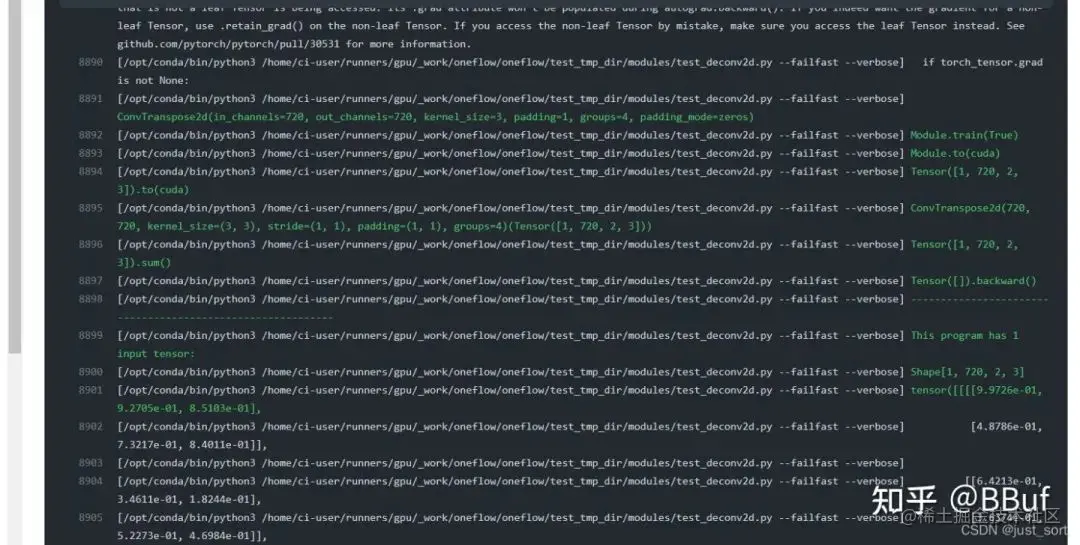 执行上述两个测试例子,自动测试框架会自动帮我们随机出各种合法参数组合成的Op,并基于数值和类型完全相同地输入Tensor(PyTorch和OneFlow各有一份)分别运行PyTorch和OneFlow的代码,并完成算子的自动测试。由于自动测试框架的用法对齐了PyTorch用法,我们在开发算子之后编写测试样例将非常简单。不用再引入其它的标准库或者使用Numpy去模拟一遍算子的前向反向计算过程等,解放了生产力。