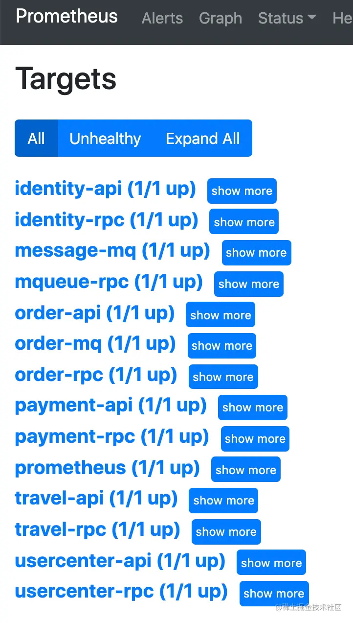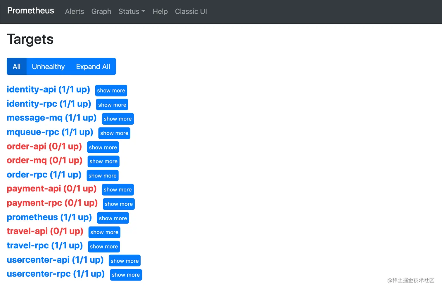 可以看到prometheus也显示成功了,同理把其他的也排查一次,启动成功就可以了