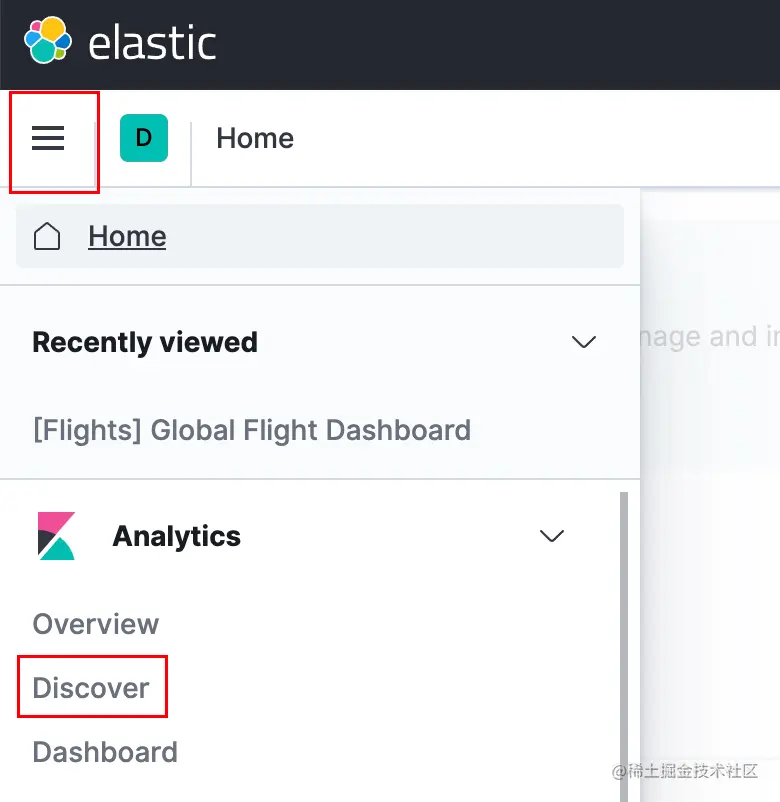 点击左上角菜单(三个横线那个东东),找到Analytics - > 点击discover