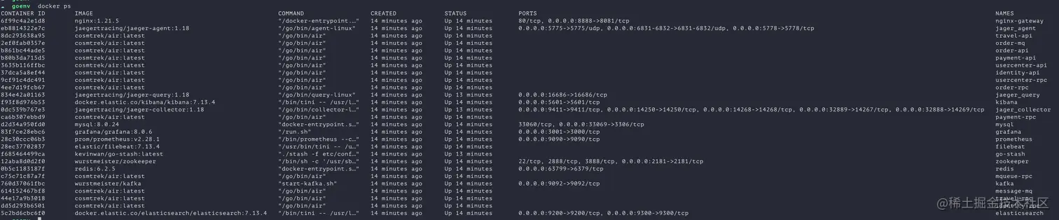 - cosmtrek/air : 我们业务代码开发依赖的环境镜像,之所以用这个是因为air热加载,写代码实时编译太方便了,这个镜像是air+golang,实际上我们启我们自己的业务服务后,我们的业务服务是运行在此镜像中的