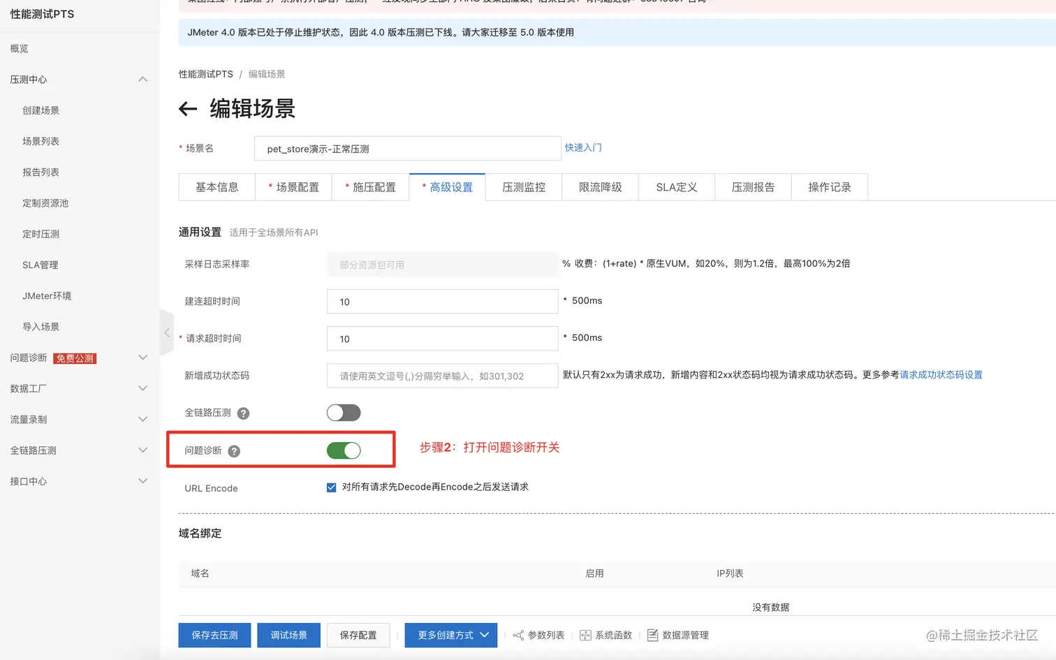 然后,我们在 PTS 控制台的【压测中心】->【创建场景**[3]**】中创建压测场景,这里可以选择 PTS 场景或者 JMeter 场景等,这里以 PTS 场景为例,因为本次演示主要是验证问题诊断的能力,所以需要在场景配置中的【高级设置】中打开问题诊断开关。具体的监控采集规则,PTS 会为用户推送默认采集开关打开的配置,同时,将采样率设置为千分之一,用户也可根据自己的需要进行自定义。