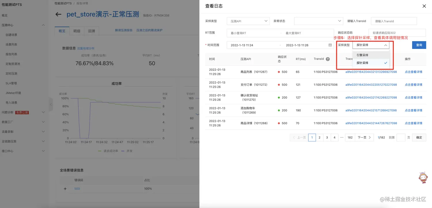 针对异常的接口,我们可以在调用链中看出对应的错误原因,同时,用户可以根据具体的报错堆栈对服务端的问题进行排查和优化。压测过程中用户可以实时的查看指定请求的调用链,同时,压测结束之后,也可以从压测报告中对问题进行回溯。