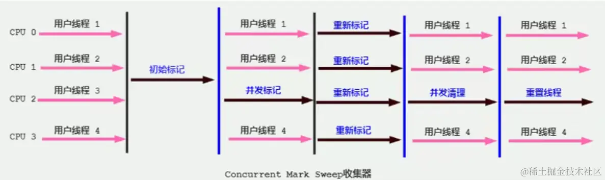 CMS垃圾回收器在jdk1.5时诞生,在jdk的历史上有划时代的意义,因为他是第一个并发垃圾回收器,支持垃圾回收线程和用户线程交替执行,从而达到低延迟的目的.