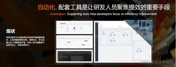 接下来,我们聊聊自动化。软件开发也借鉴了很多汽车生产自动化的方法。我们只需要用鼠标灵活拖拽,就能够把逻辑分别放到阿里云,私有云,边缘计算节点等等,从而轻松交付到测试环境。