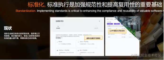 接下来,我们再谈一谈标准化。如果在汽车生产过程中,没有强有力的标准,这是灾难性。我们发现在软件开发过程中,面临的挑战更大。很多企业有大量的研发人员,有的企业严重依赖供应商提供的人力团队。这种情况下,我们面临较高的人员流动。经常会有新的项目组成员加入到团队中上来。所以我们能不能通过引入云原生时代的开发模板,把微服务架构到当中。把原来的作文题,变成填空题。在这种情况下,很多标准不仅得到了执行,而且效率得大幅提升。