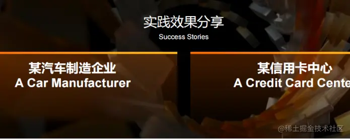 我们帮助很多客户进行了这方面的实践。今天列举两个例子。第一个是国内某大型汽车制造业。我们通过引入模块化,标准化,自动化。通过一站式应用平台,帮助客户在软件研发,测试运维的效率提高30%以上。第二个是国内某大型信用卡发卡机构。除了帮助他们在研发层面效率提升,我们还通过平台帮助客户将30个以上的容器集群实现业务的灵活分发和交付。