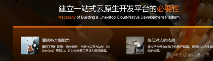所以我们建立了一站式云原生开发平台。希望通过这个平台帮助客户提高开发效率。我们在帮助各个业务实现数字化的同时,也要思考软件开发本身的数字化转型。如果我们把所有的资产进行数字化归档,能够有效避免人员流失导致系统瘫痪的情况。