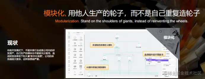 第二个方面,在进行各种模块的组装过程中,在设计和规划软件时,提前把这些模块之间的API定义清楚,把不同的模块开发任务交付到不同团队来实现。架构师再进行图形化的模块组装。