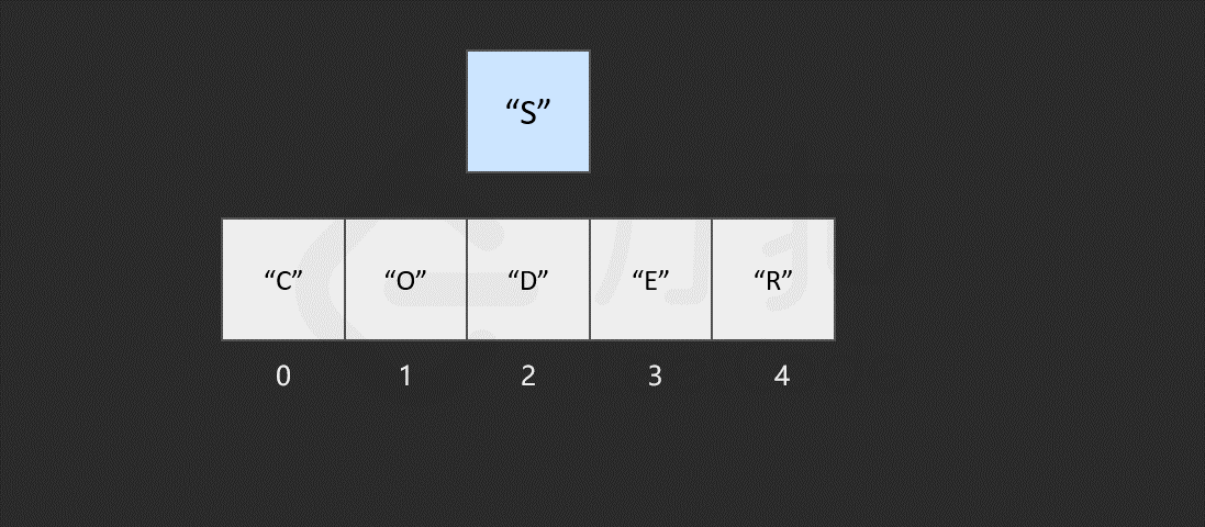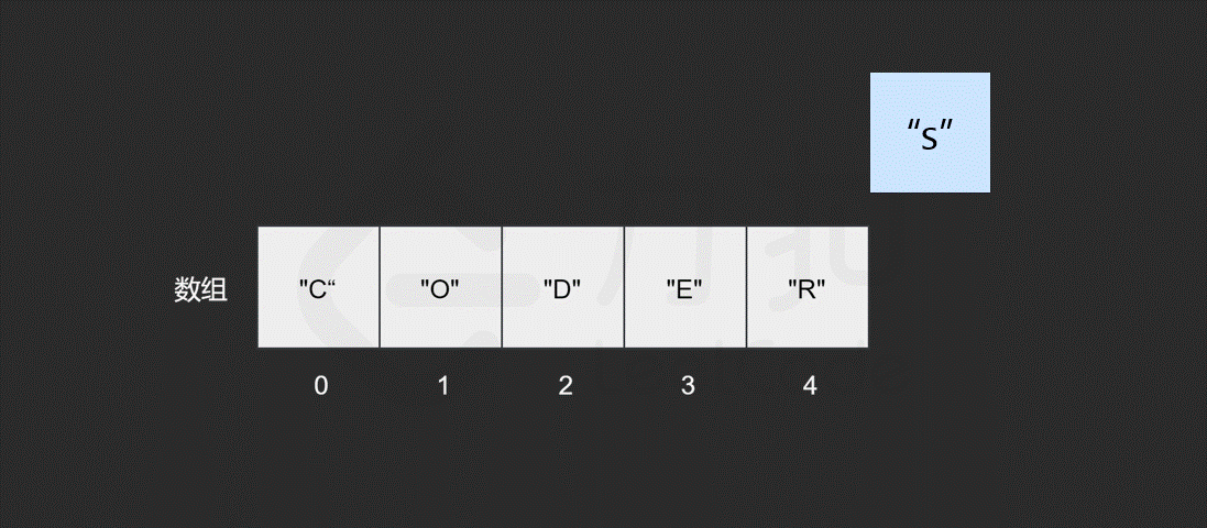 假如我们想在数组["C", "O", "D", "E", "R"]中插入一个元素"S"。