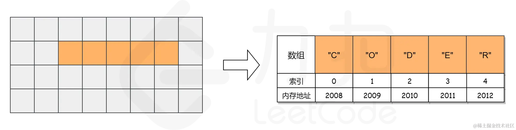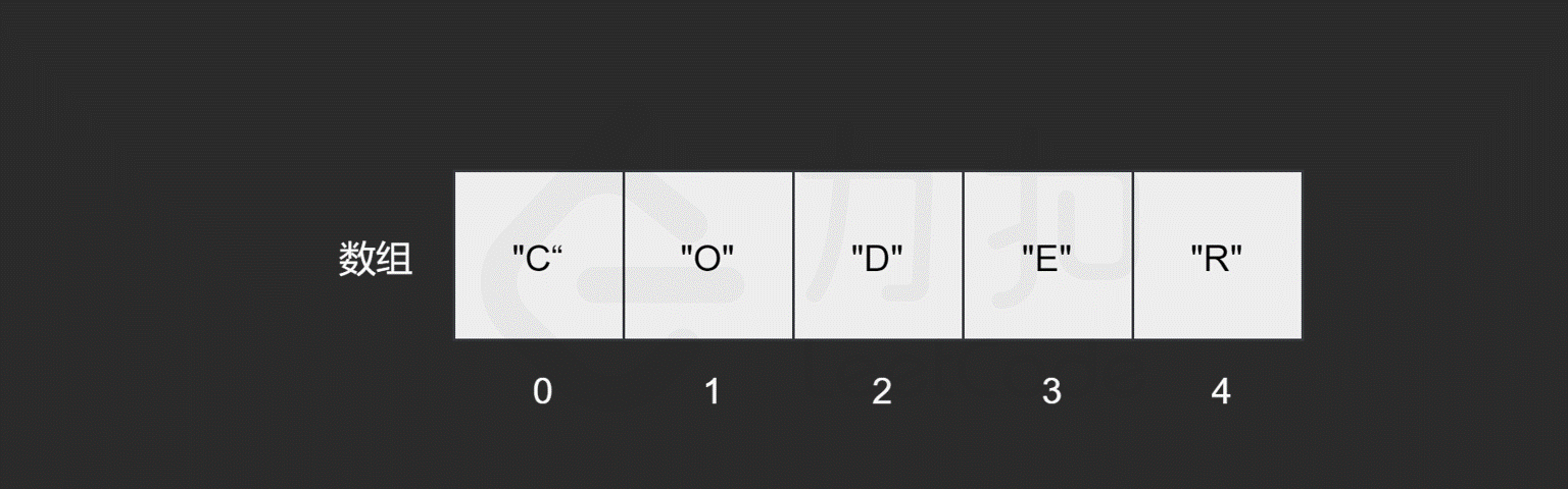 **对于数组来说,由于其元素在内存中是连续存储的,所以计算机会在内存中为其申请一段连续的内存空间,并且记下索引为0处的内存地址。**以["C", "O", "D", "E", "R"]数组为例,它的各元素对应的索引及内存地址如下图所示。