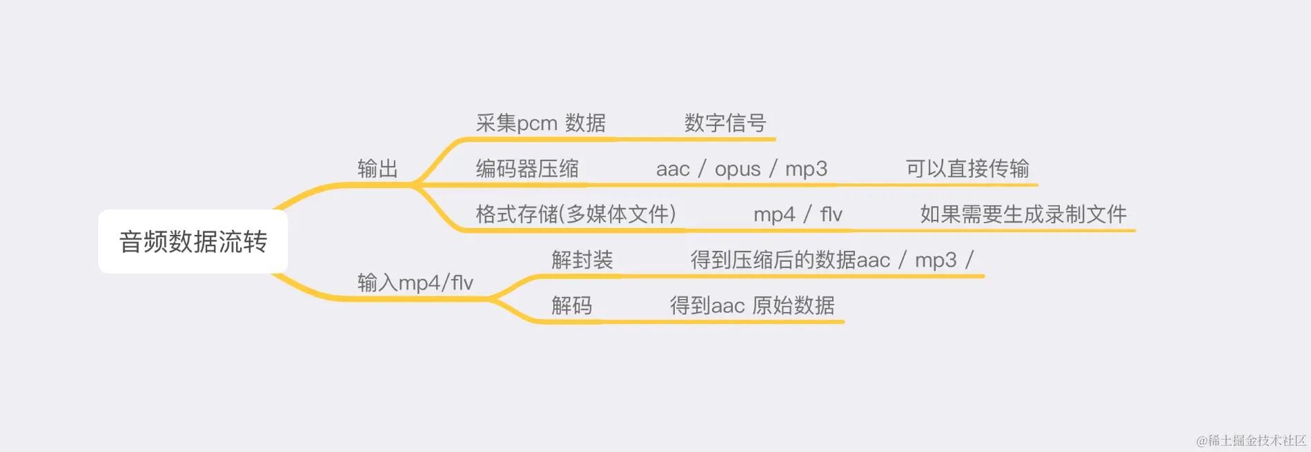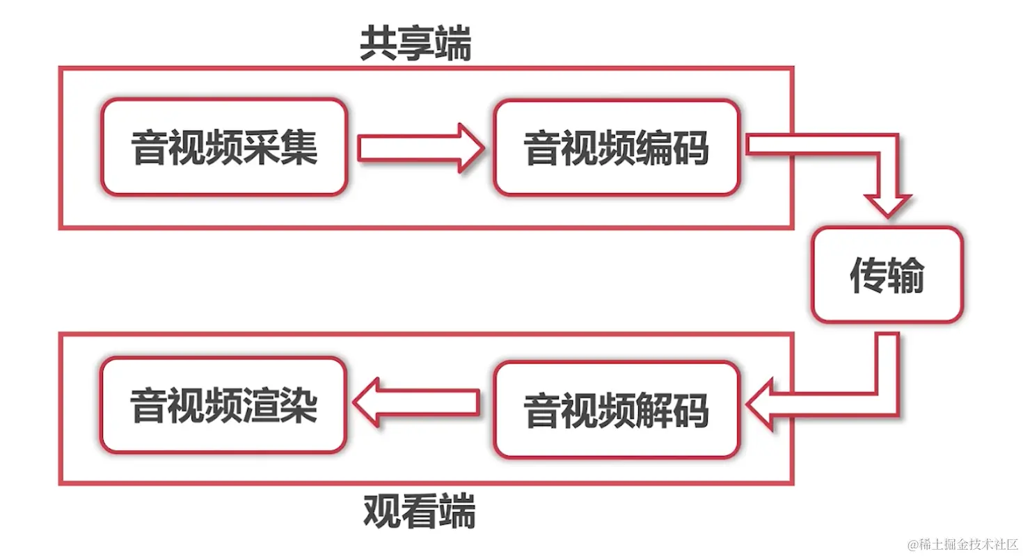 如上图,音频从共享端经过采集、编码压缩 传输到观看端进行解码、渲染完成整个流程.