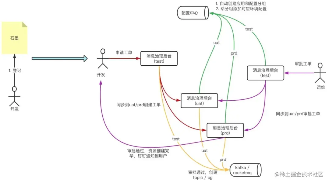 我们对消息化的资源管理做了一个PaaS化的管理,对功能做了一些限制,开发和运维只能在测试环境下做申请和审批,审批通过后再同步到其它环境,然后创建资源、通知用户。