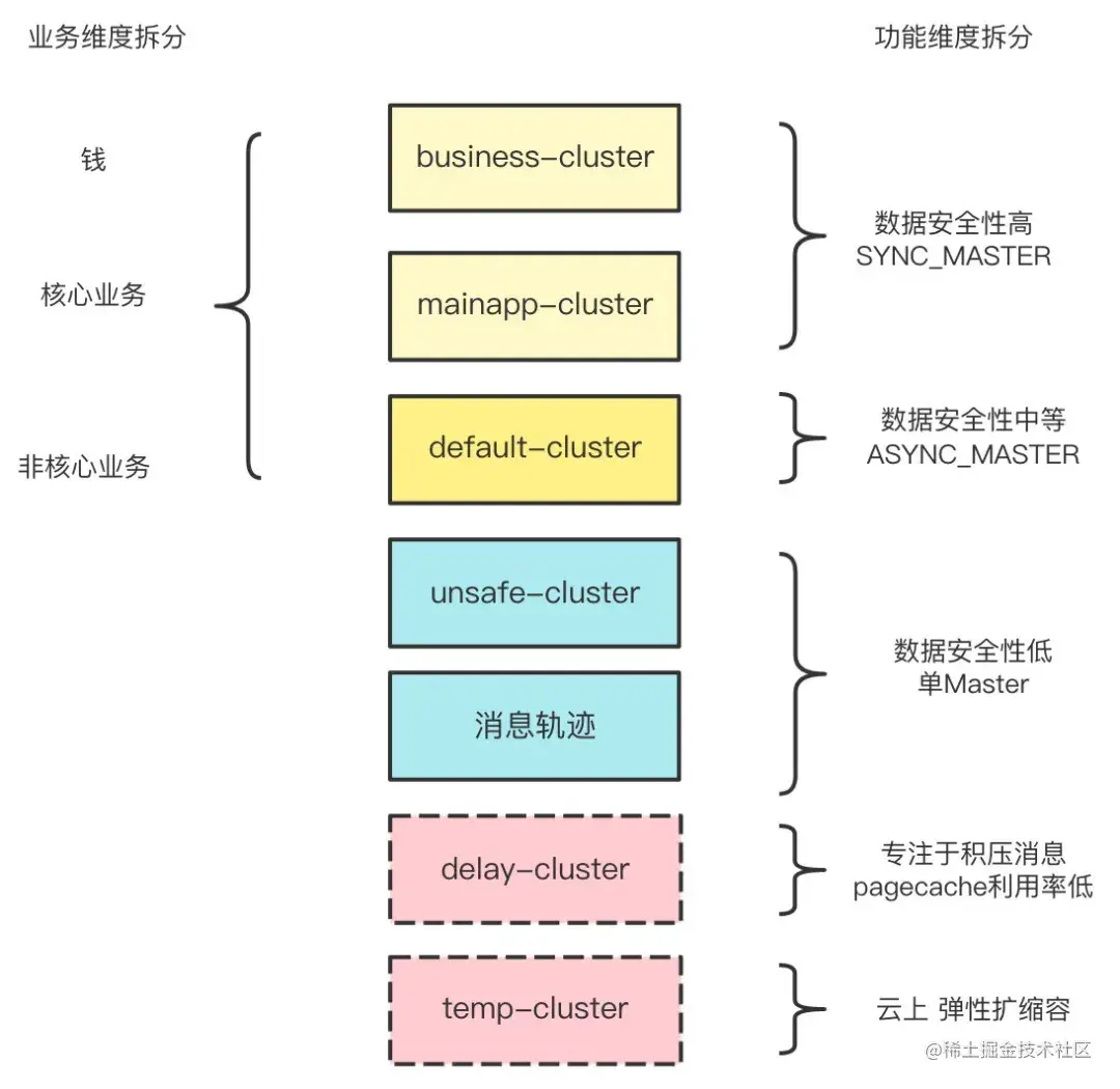 - 对于其它数据安全要求不高的业务,包括消息轨迹,我们使用单MASTER集群,保证了性能需要,资源使用也少;