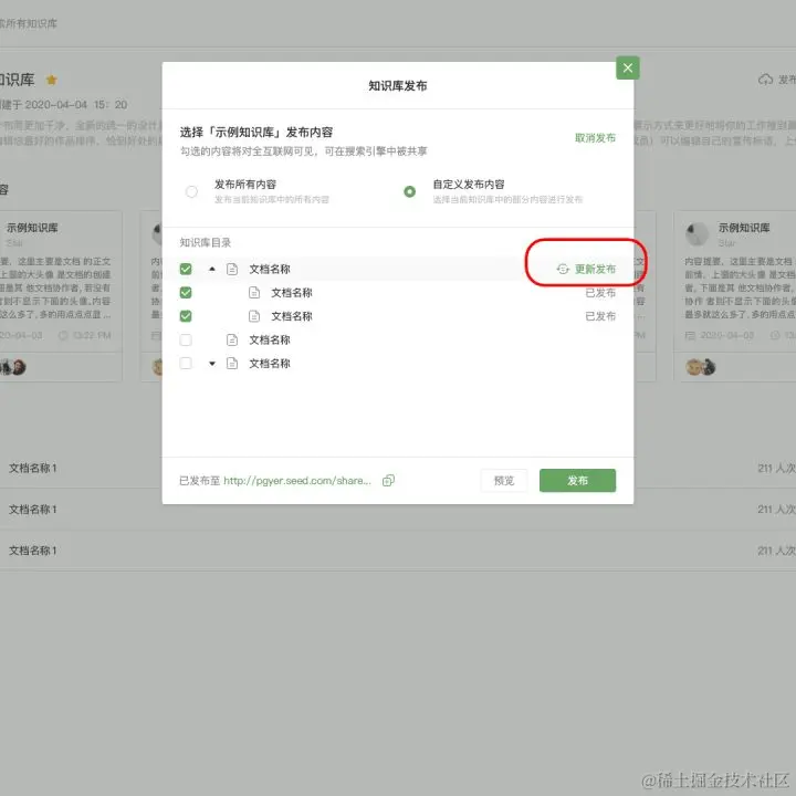在已发布的知识库中,可以有选择性地更新单篇或多篇内容,进行更新发布。