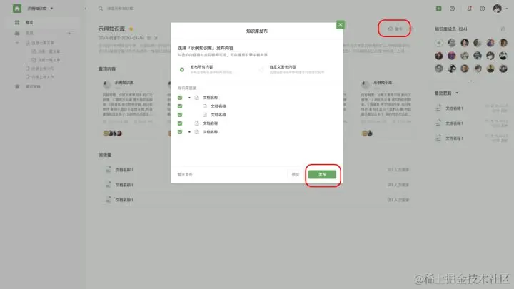 你可以选择将企业内知识库的完整内容发布出去,也可以通过在目录上选择将知识库内的部分内容发布出去。在知识库主页,你可以找到发布配置的入口。