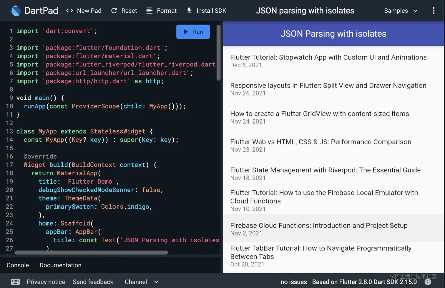 我们将主要关注在Dart中解析JSON的代码,但我也将分享一个Flutter应用程序的例子,以便我们可以看到一切是如何配合的。如果你感到好奇,这里是在Dartpad上运行的。