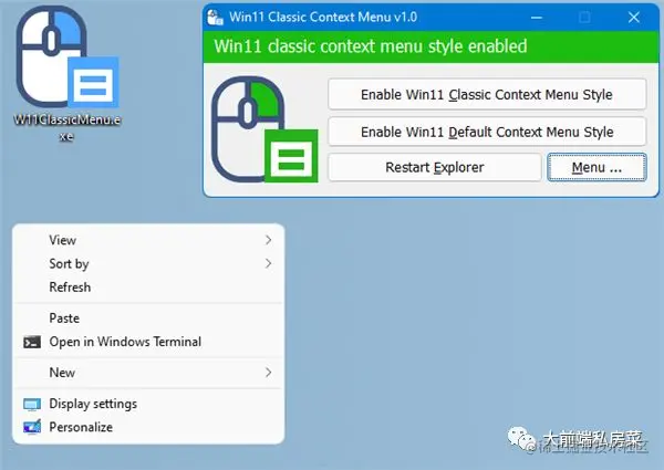 Windows11ClassicContextMenu的原理是和上文修改注册表的方法一样的,只不过它将这些步骤封装成为了一个绿色小软件,点击一下就可以修改注册表,实现同样的功效。