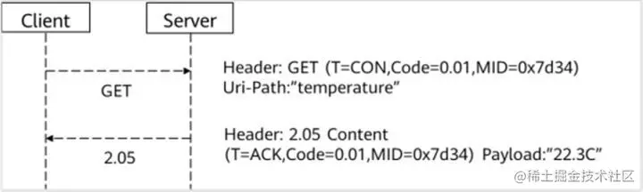 CoAP(ConstrainedApplicationProtocol,受限制的应用协议),专门为资源受限设备(如传感器节点)和网络(如NB-IoT,LoRa)而设计。CoAP从HTTP协议发展而来,CoAP协议也是采用请求/响应工作模式,客户端发起请求,服务器做出响应。为了克服HTTP对于受限环境的劣势,CoAP既考虑到数据报长度的最优化,又考虑到提供可靠通信。