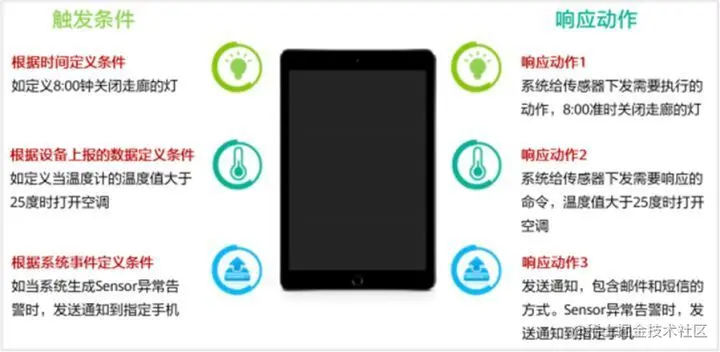 规则引擎的使用对象是终端用户,系统已经预置支持的规则场景,终端用户通过方便、易理解的友好界面在自有设备下制定自动化规则。
