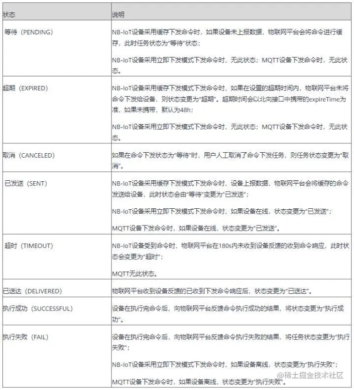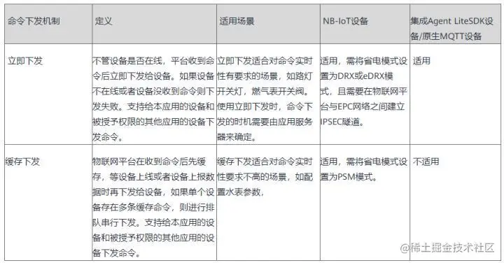 平台向设备下发命令包括立即下发和缓存下发两种情况,如下表所示。