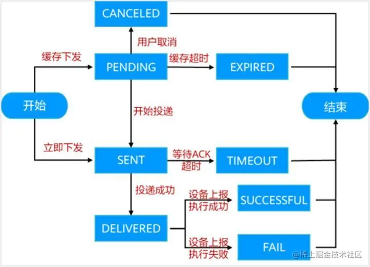 对于立即下发模式,下发的命令直接全部下发给设备;对于缓存下发模式,需等待设备上线或设备上报数据到平台后,按照串行的方式下发命令给设备,即缓存的命令需要按照缓存的时间逐一向设备进行下发。设备命令整个生命周期的状态转换如下图所示。