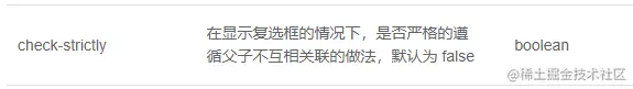 设置完当前节点后则要处理当前节点的父节点,如果父节点不存在或者层级为第0层(根节点)则返回,否则判断父子节点之间是否严格不关联,如果不是的话,则递归检查父节点。关于checkStrictly,文档中有如下说明: