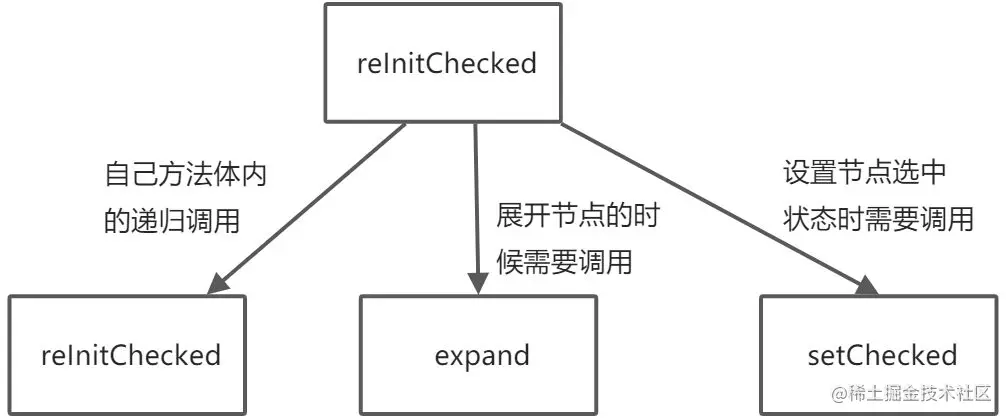 根据recursion判断是否需要更新父节点的选中状态,如果需要则调用reInitChecked方法。注意更新父节点选中状态是放在最后进行的,原因是显而易见的。