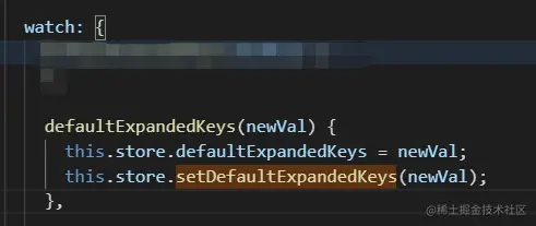 setDefaultExpandedKeys用于设置默认展开的节点,遍历数组的每一项根据key获取node,node再调用expand方法。在el-treee的defaultExpandedKeys属性变化时调用这个方法,如下图所示: