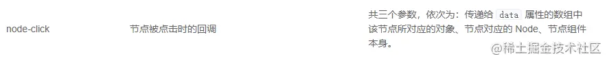 最后是让树触发node-click事件,传递的参数很好理解,看一下文档对node-click的描述:
