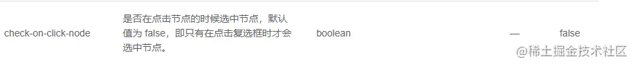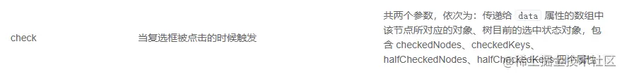 handleCheckChange方法定义了勾选状态发生变化后执行的动作。首先调用Node类的setChecked方法,之后触发check事件。看一下文档对check事件的描述:
