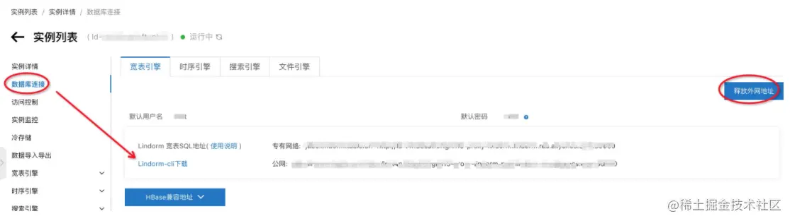 进入数据库实例控制台,在“数据库连接”中下载SQL工具:Lindorm-cli。同时,为了能够让本机可以访问集群,需要“开通外网地址”,并将本机ip加入到白名单中。