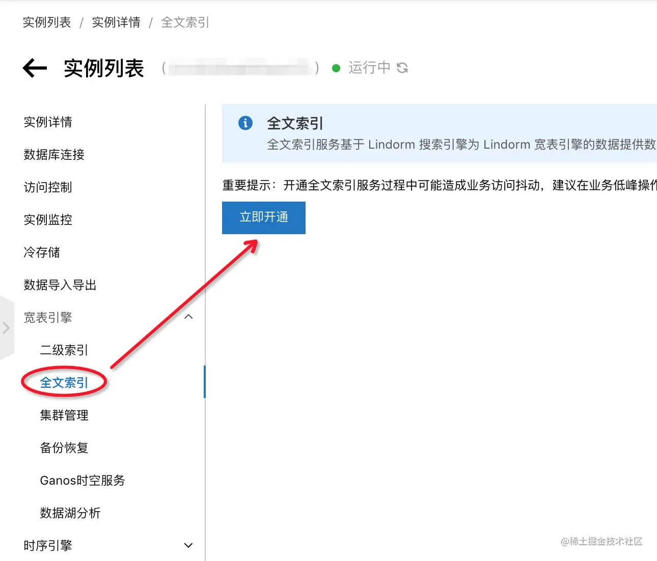 当您购买Lindorm宽表引擎后,可以在数据库实例控制台开通“全文索引”功能,如下图: