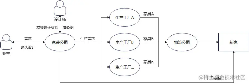 案例一:在定制家居行业,一家公司提供了全套的软件方案。即先为设计师提供一个家装设计软件,该软件可以让设计师设计好柜子、墙面、桌椅以及摆放位置等,然后直接出360°渲染图,让业主沉浸式地体验,给出评价。确认ok后,软件直接进入拆单环节,把设计图中的所有家具拆解成一件件可以生产的物件,包括xx品牌桌子、xx型号的柜子门板等等,这些数据再直接送到各家生产工厂,生产完成后,再安排物流送货上门,然后调配工人上门安装….一条龙服务在软件中无缝衔接,数据在不同企业、不同作业人员的工作界面上流动。
