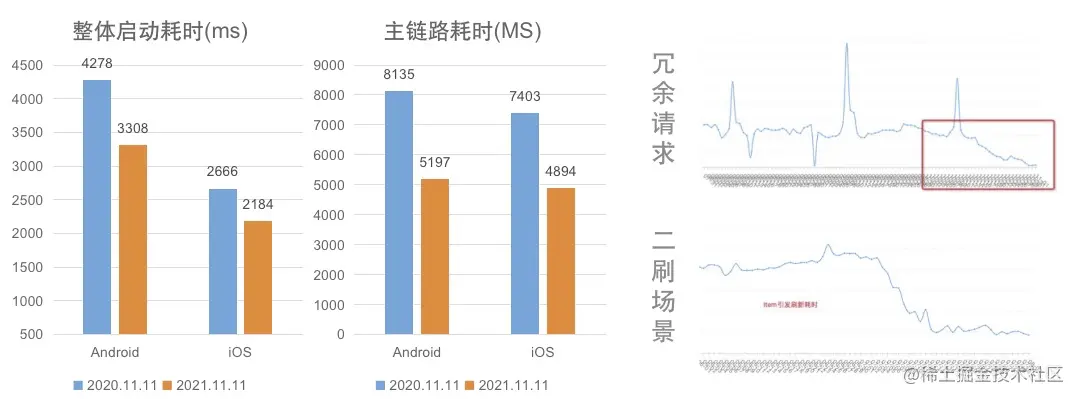 - 对于应用启动耗时:同比去年D11 Android启动整体耗时提升23%,iOS启动整体耗时提升20%;