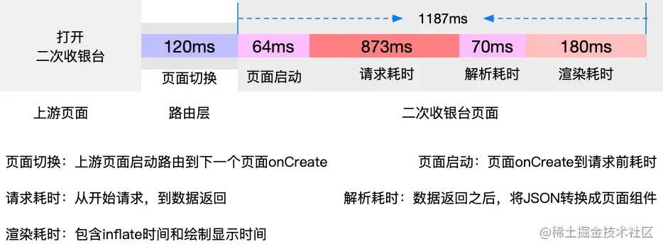 优化的核心思想:后事前移,串行改并行。mtop本身不依赖Activity,可以直接放到路由层去开始请求,同时我们渲染的流程实际上是包含了加载布局的时间(inflate)加绘制流程时间(即measure+layout+draw),通过本地自测可以看到收银台支付列表的一个布局,inflate一般会耗时20ms左右而一般需要5个这样的布局才能基本覆盖80%的页面大概耗时100ms(低端机可能会更多),那么这个渲染流程实际上也是可以提前加载的。