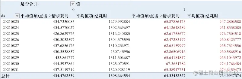 - 借助AB实验分析,优化带来了100ms的性能提升(701.62ms->604.74ms)提高14.29%