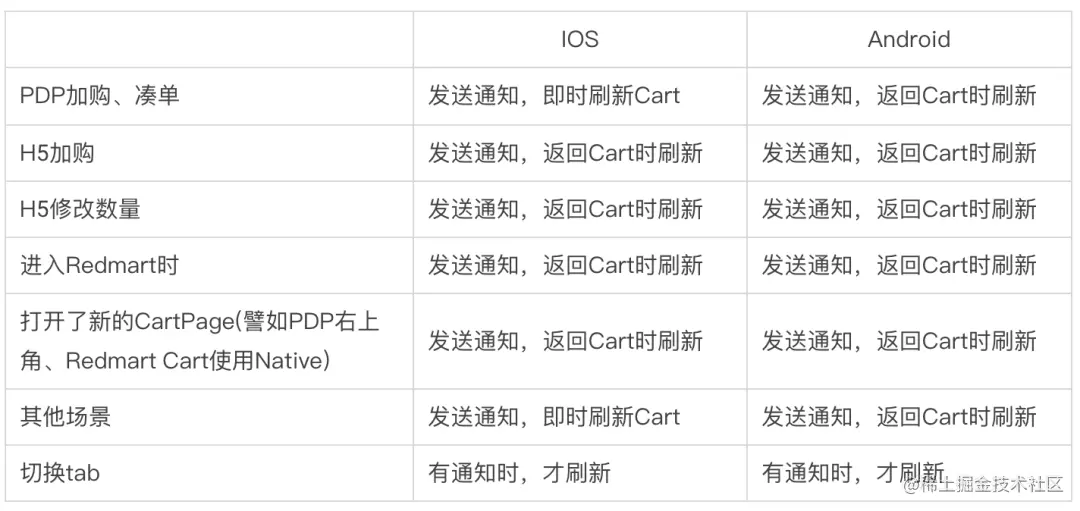 Android侧仅开放“重回购物车时刷新”,这是考虑到“大促场景下Android用户群体庞大,加购动作如果直接绑定Cart刷新行为可能引发流量压力”;同时,Android侧提供了“即时刷新购物车”的能力以便于特殊场景下的使用。