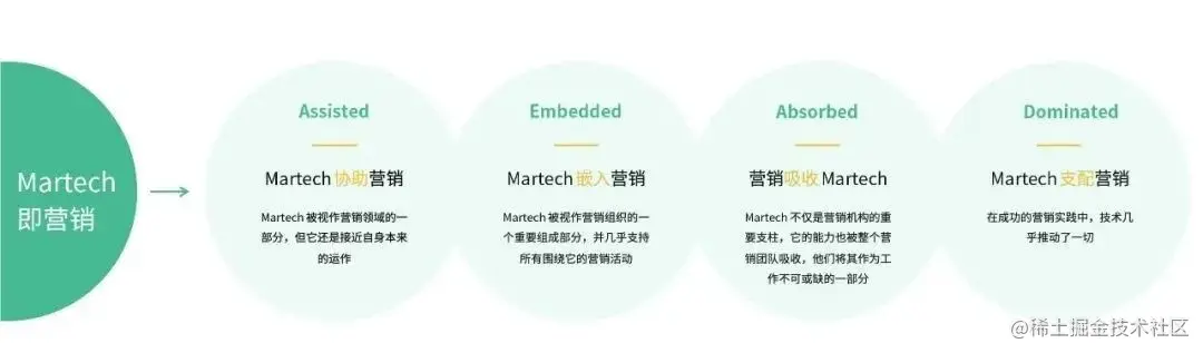 2019 年,Scott Brinker 提出**“Martech 即营销”**的观点,他认为 Martech 与营销的关系发展可以划分为四个阶段:Assisted-Embedded-Absorbed-Dominated。许多公司在最初的阶段将 Martech 视作特定任务的单点解决方案。大多数大公司已进入“嵌入”阶段,大多数数字原生代(随数字科技成长起来的公司)已进入“吸收”阶段。