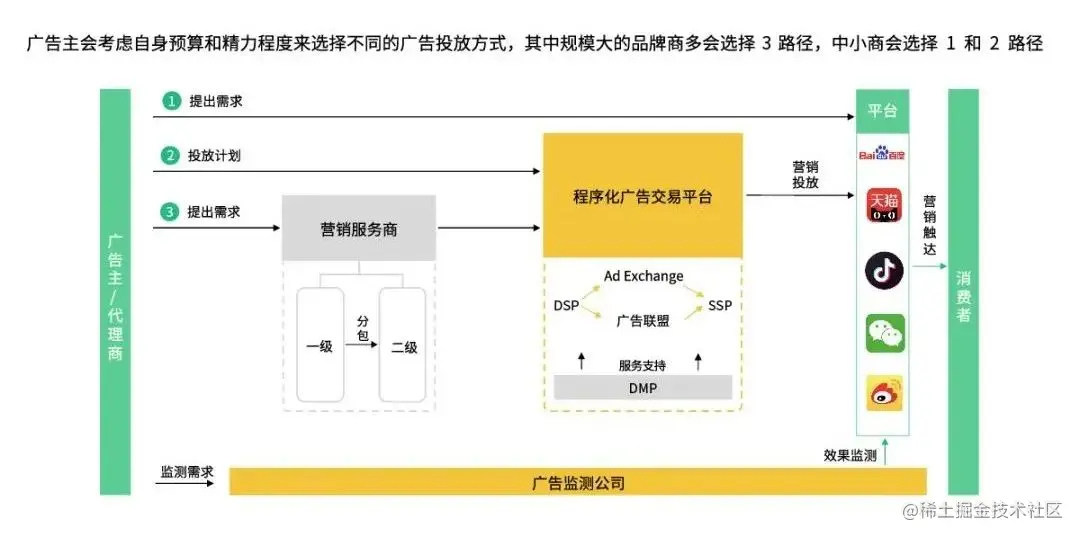 广告业务的需求侧即企业主(或称营销主、广告主)。企业主希望通过广告让受众在心中对品牌、产品或服务形成一定印象并在需求产生时进行购买。这时企业主需要寻找有用户流量的地方(媒体、搜索)进行投放,而如何解决流量平台数量众多的问题?企业主可以拆分预算交由媒介代理,通过一站式交易台、透明化程序化广告单元等方式对接需求方平台 DSP(Demand-Side Platform)。像股票市场一样,需求方平台可以对接广告交易市场中的公开交易(公开竞价)及私有交易市场中的广告流量进行实时竞投,并交由程序化广告投放服务(Adserving)统一管理媒体广告流量曝光机会,展示相关广告素材。